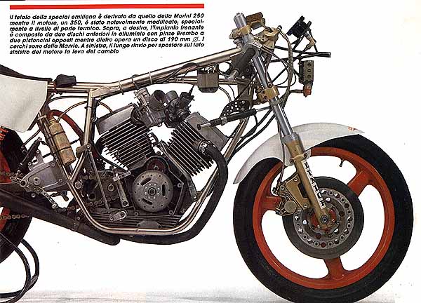 This bike is based on a Morini 250 frame - lighter than the 3 1/2 one - that has been polished by Imerio Vizzani and varnished. The magnesium-alloy swingarm was a second-hand part, and the wheels (on the 400cc. version) are Marvic. The brakes up front are two front 270mm discs with Brembo two piston calipers (they cost much less than the four piston brakes!). Giving extraordinary attention to every detail and doing scrupulous lightening work, the dry weight has been kept at only 102kg.